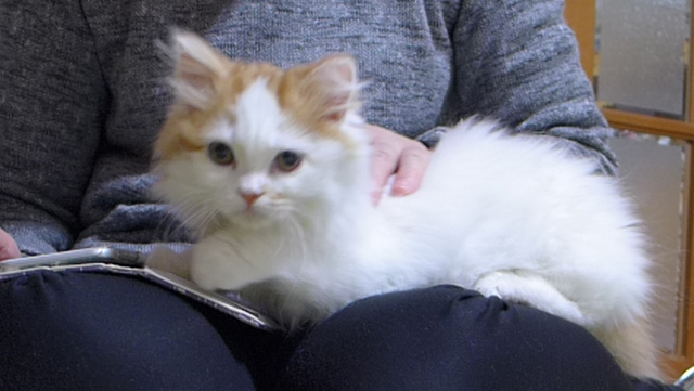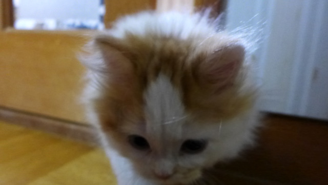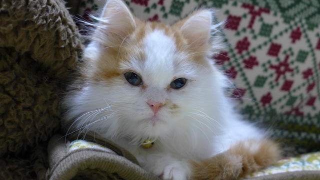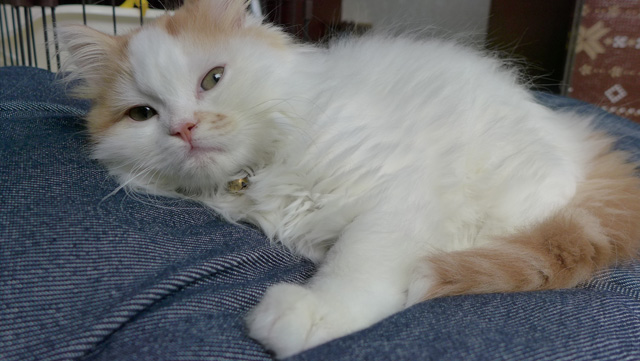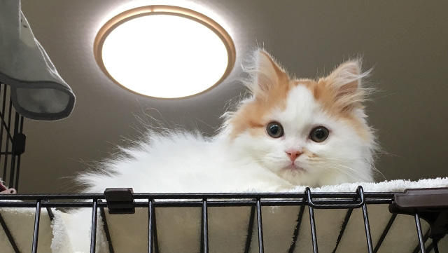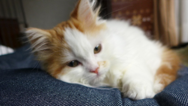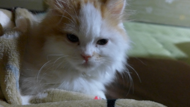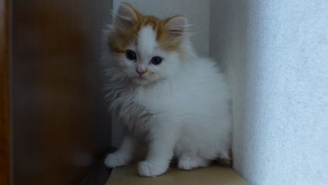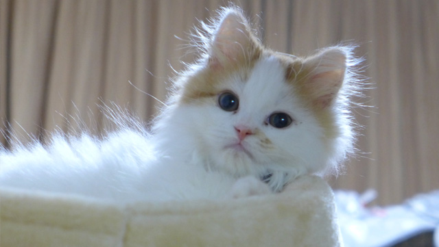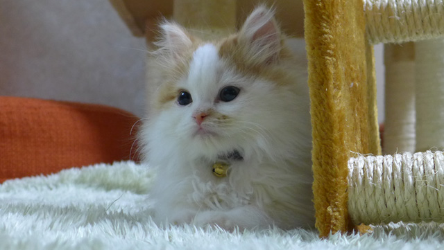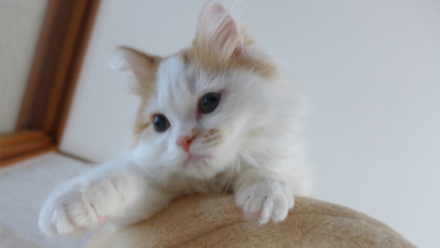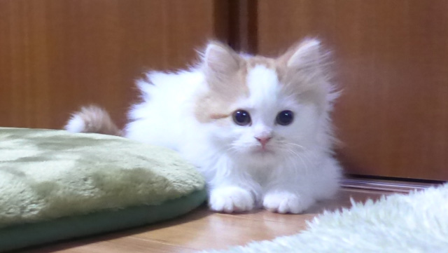 プロフィール:名前は、まろくん。マンチカン・長毛・長足・レッドダビーホワイトバン・男の子・2018/12/21生まれ・京都府マンチの樹出身。タイトル背景は、まろくんのオデコ。