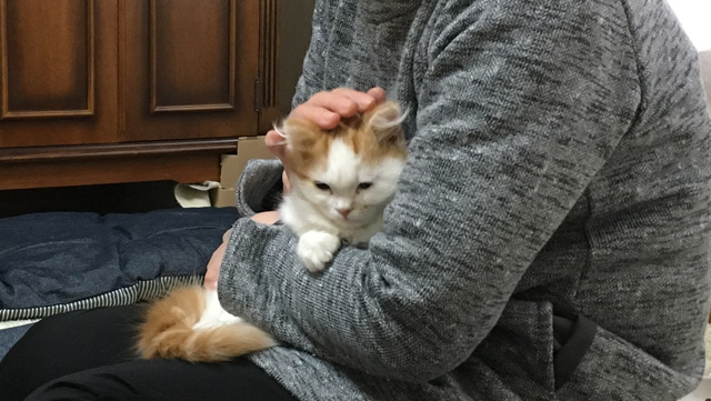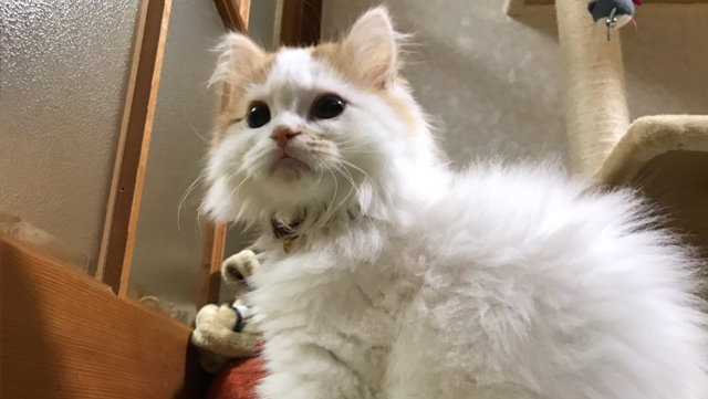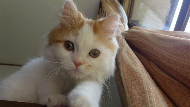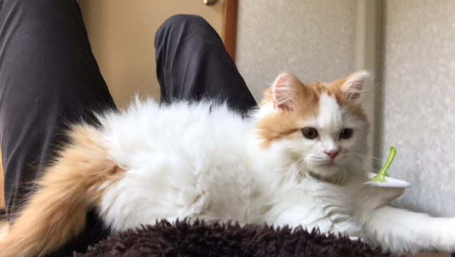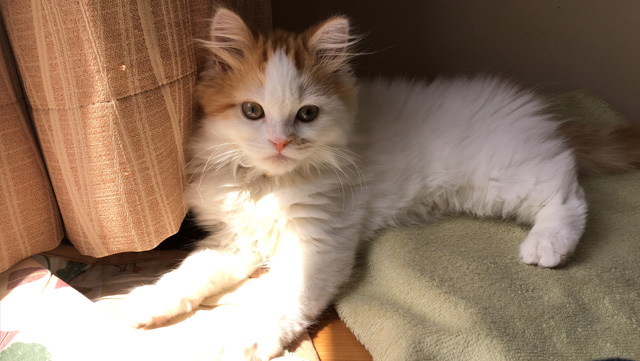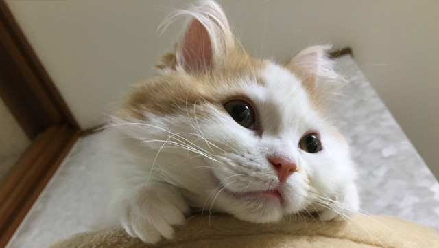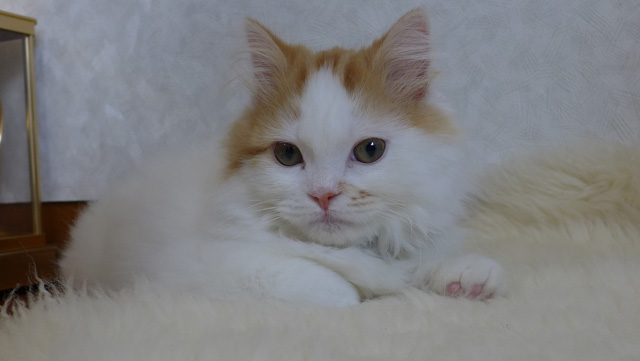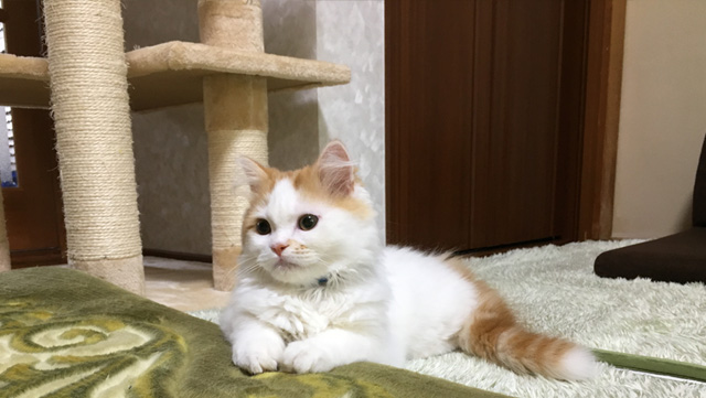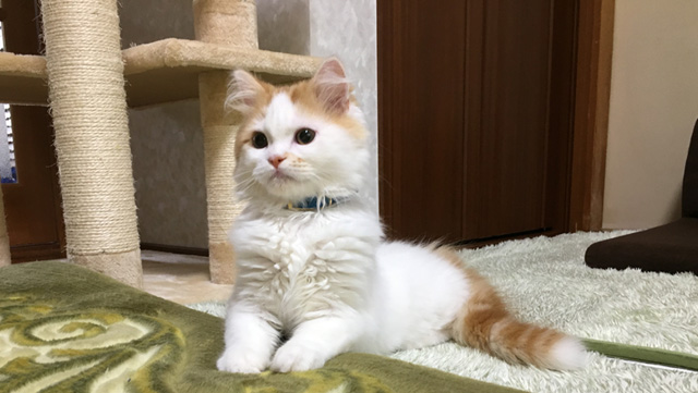 プロフィール:名前は、まろくん。マンチカン・長毛・長足・レッドダビーホワイトバン・男の子・2018/12/21生まれ・京都府マンチの樹出身。タイトル背景は、まろくんのオデコ(笑)。
