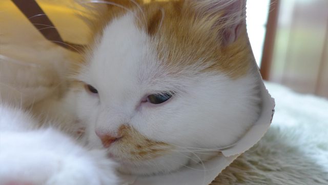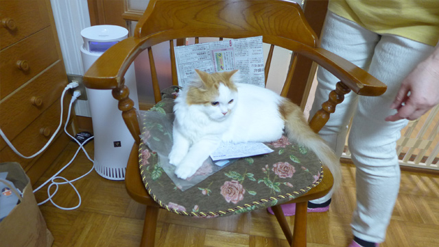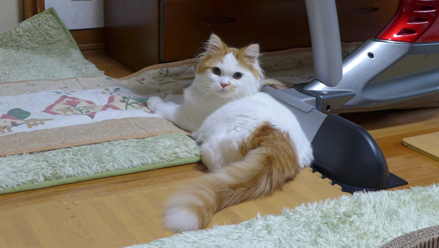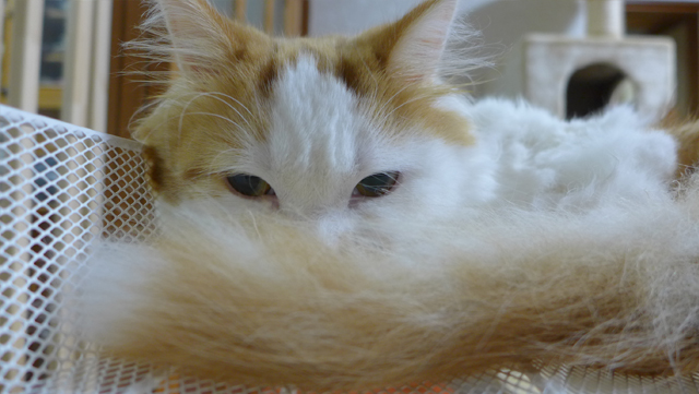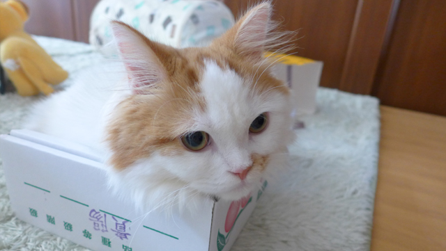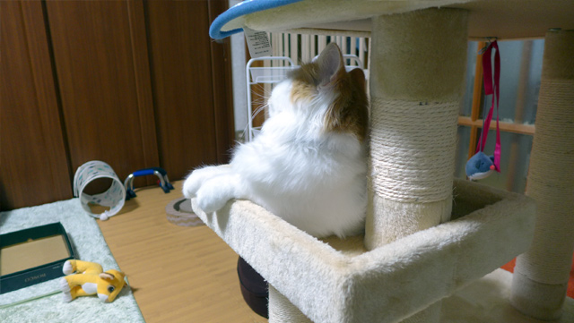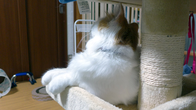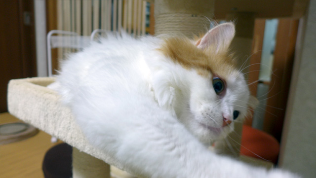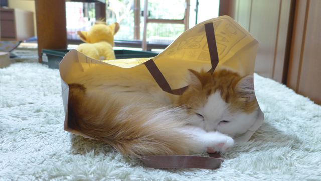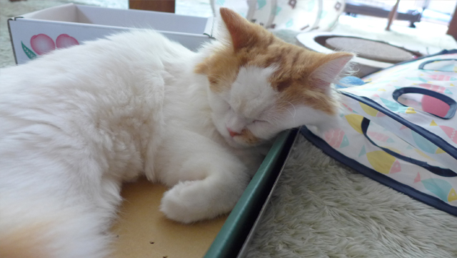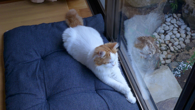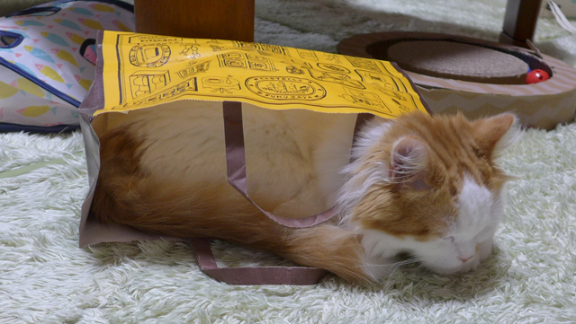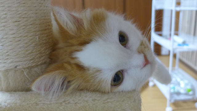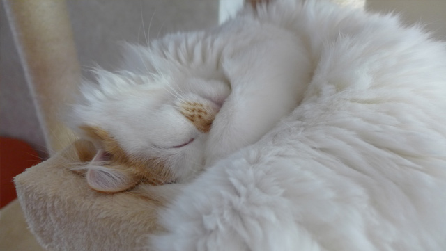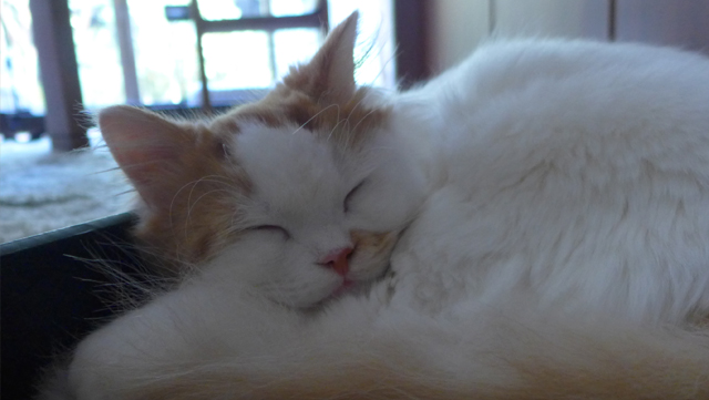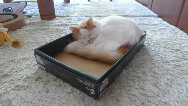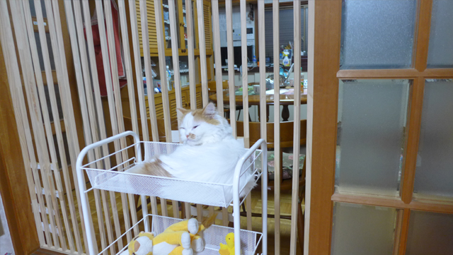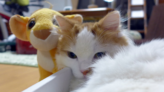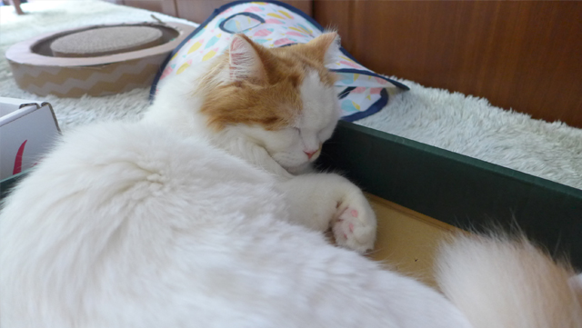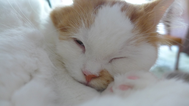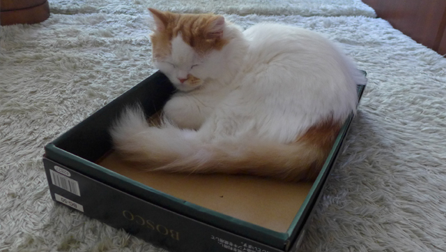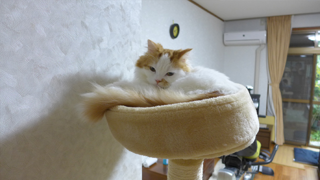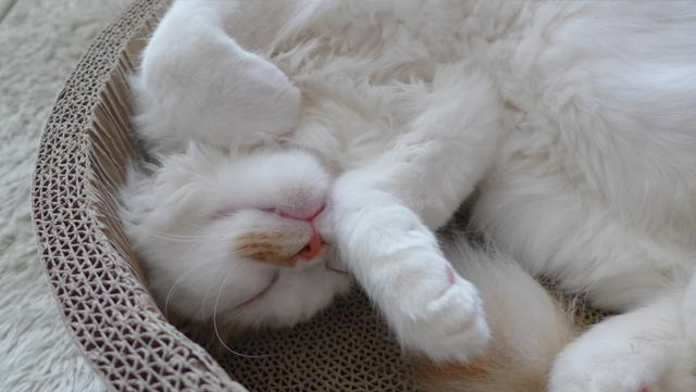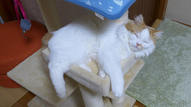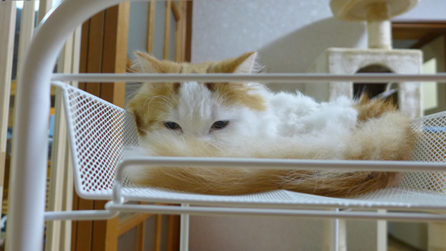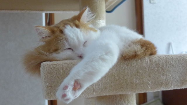 狭いところで、いろいろ体勢を変えて、いい寝心地を求めています。