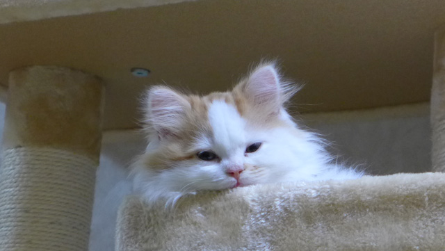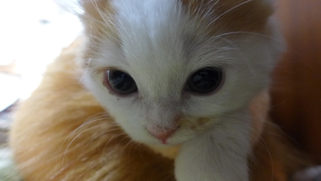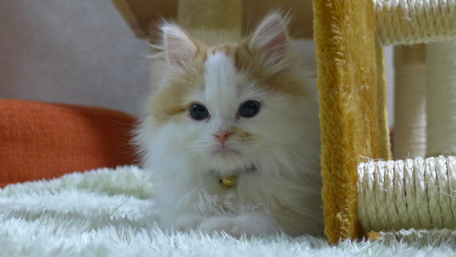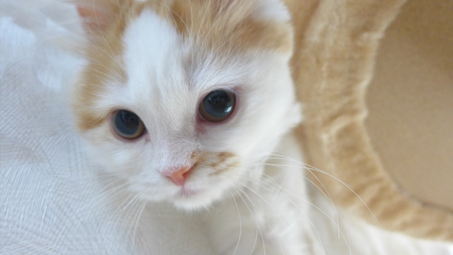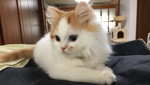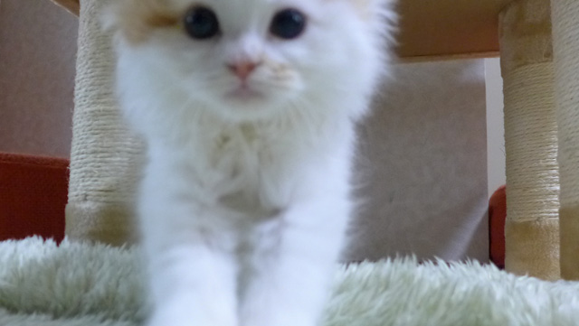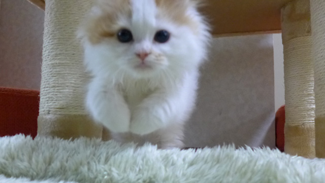 プロフィール:名前は、まろくん。マンチカン・長毛・長足・レッドダビーホワイトバン・男の子・2018/12/21生まれ・京都府マンチの樹出身。タイトル背景は、まろくんのオデコ。