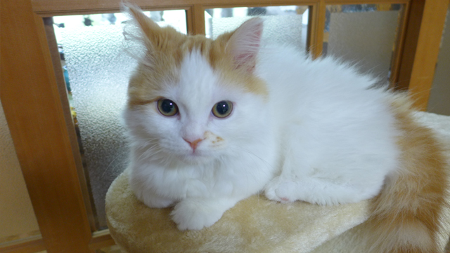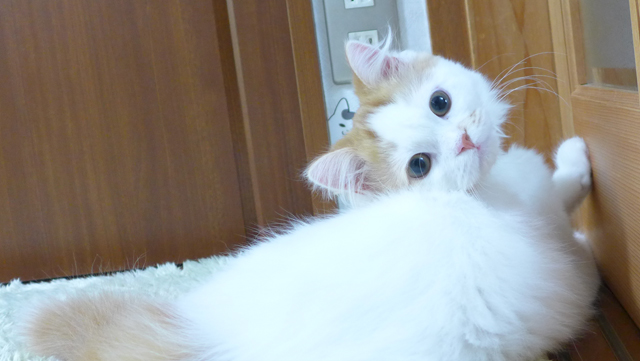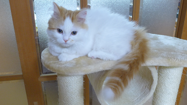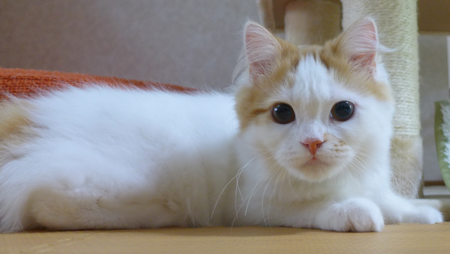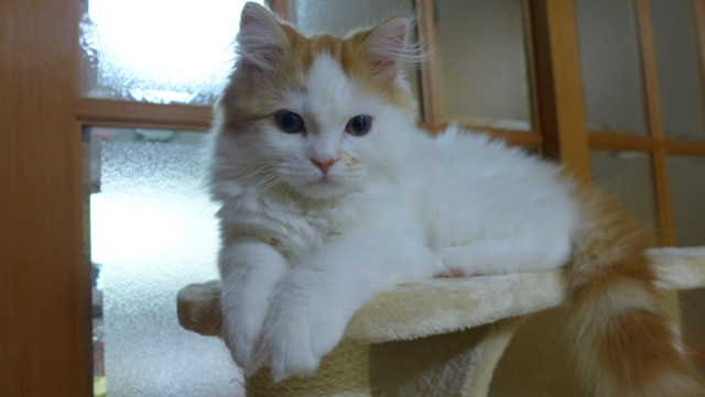 プロフィール:名前は、まろくん。マンチカン・長毛・長足・レッドダビーホワイトバン・男の子・2018/12/21生まれ・京都府マンチの樹出身。タイトル背景は、まろくんのオデコ(笑)。