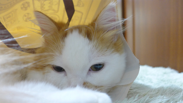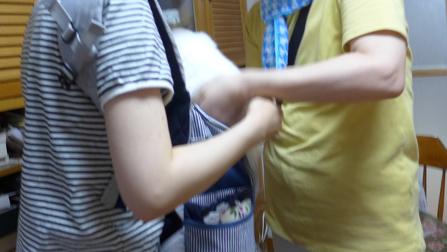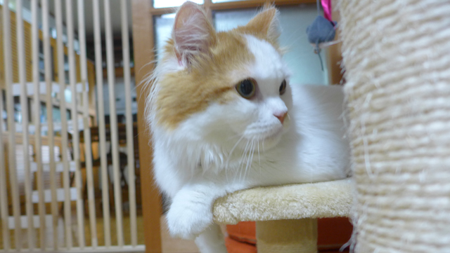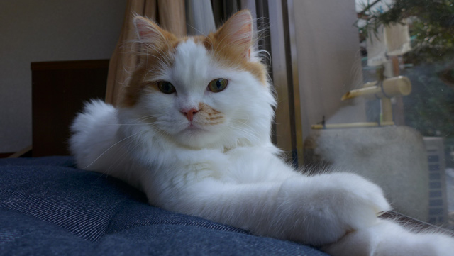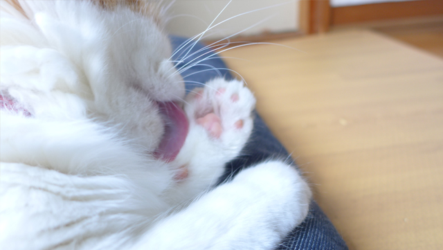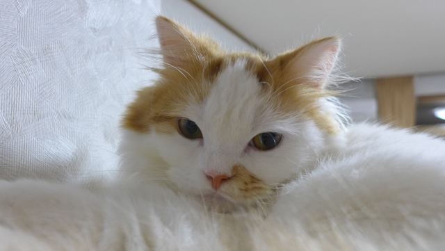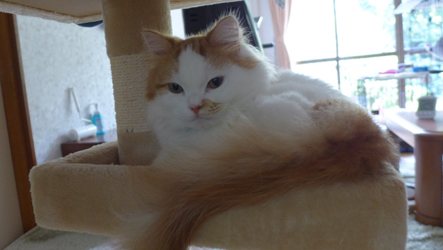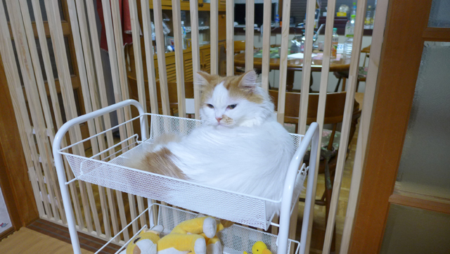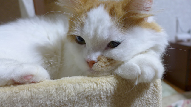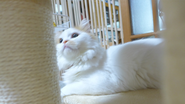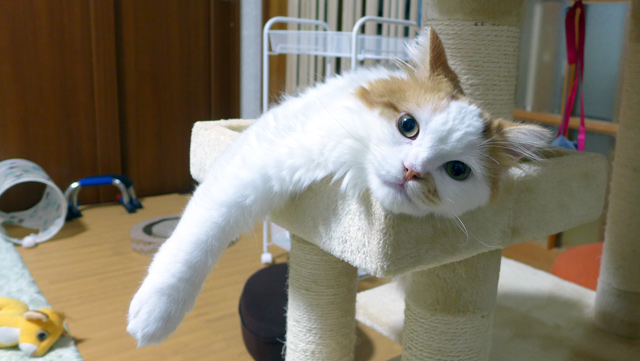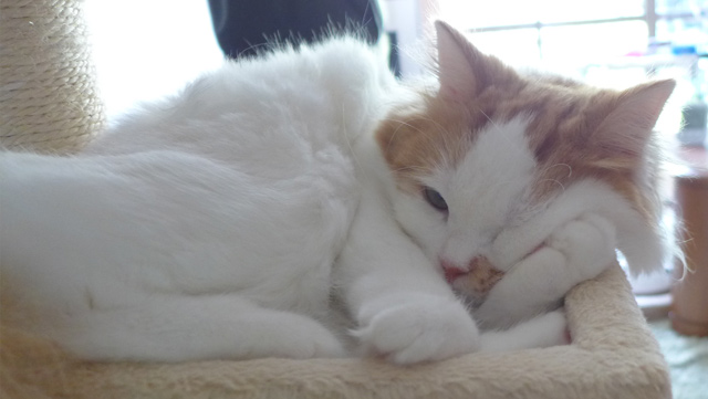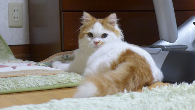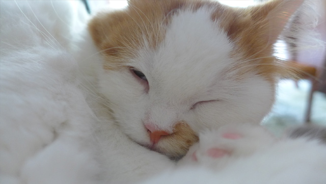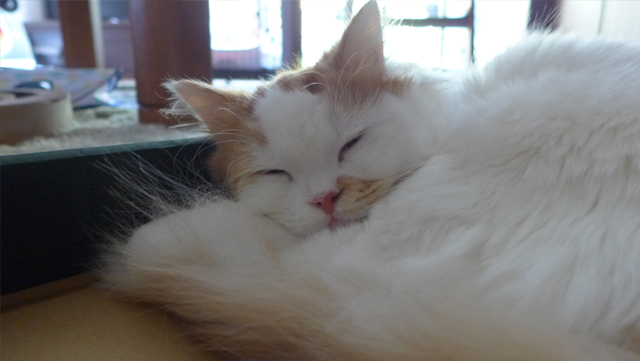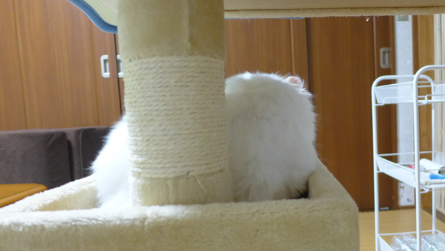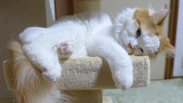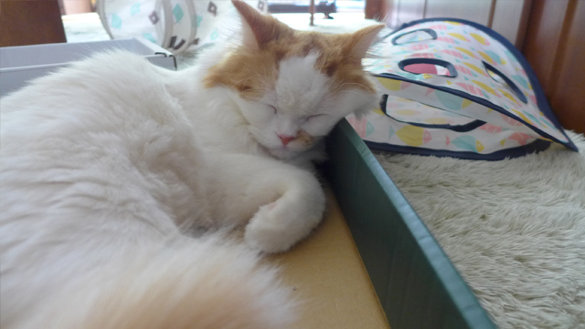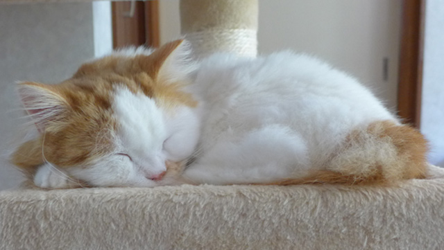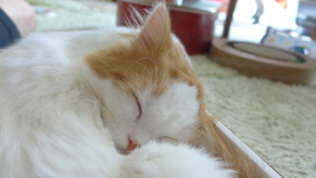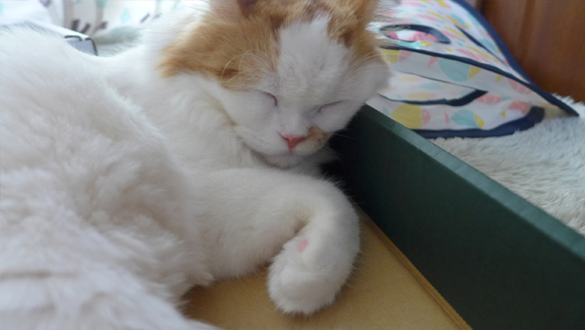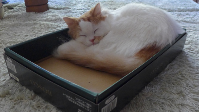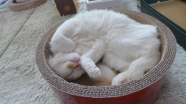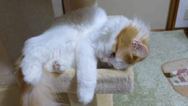狭いところで、いろいろ体勢を変えて、いい寝心地を求めています。
